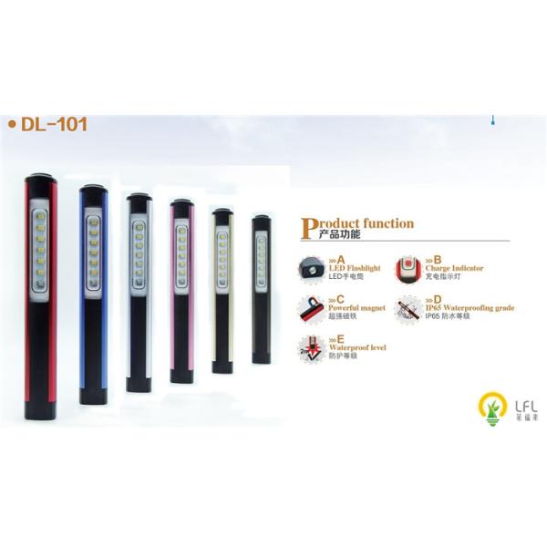 | DL101-J | lighting: working light(front) + flashlight(bottom end) wattage: 1.5W working light; 1.5W flashlight lumen: 200lm working light; 135lm flashlight runtime: 2.5h working light; 2.5h flashlight approx. charging time: 2.5h approx. size: 175 × 23 × 13.5mm weight: 66g power: rechargeable Li-Po battery (900mAh/3.7V) holding: pen clip, magnet, hand hold housing: aluminum, ABS, PC | blister card + display box | a) working light: press the button b) flashlight: press the button |